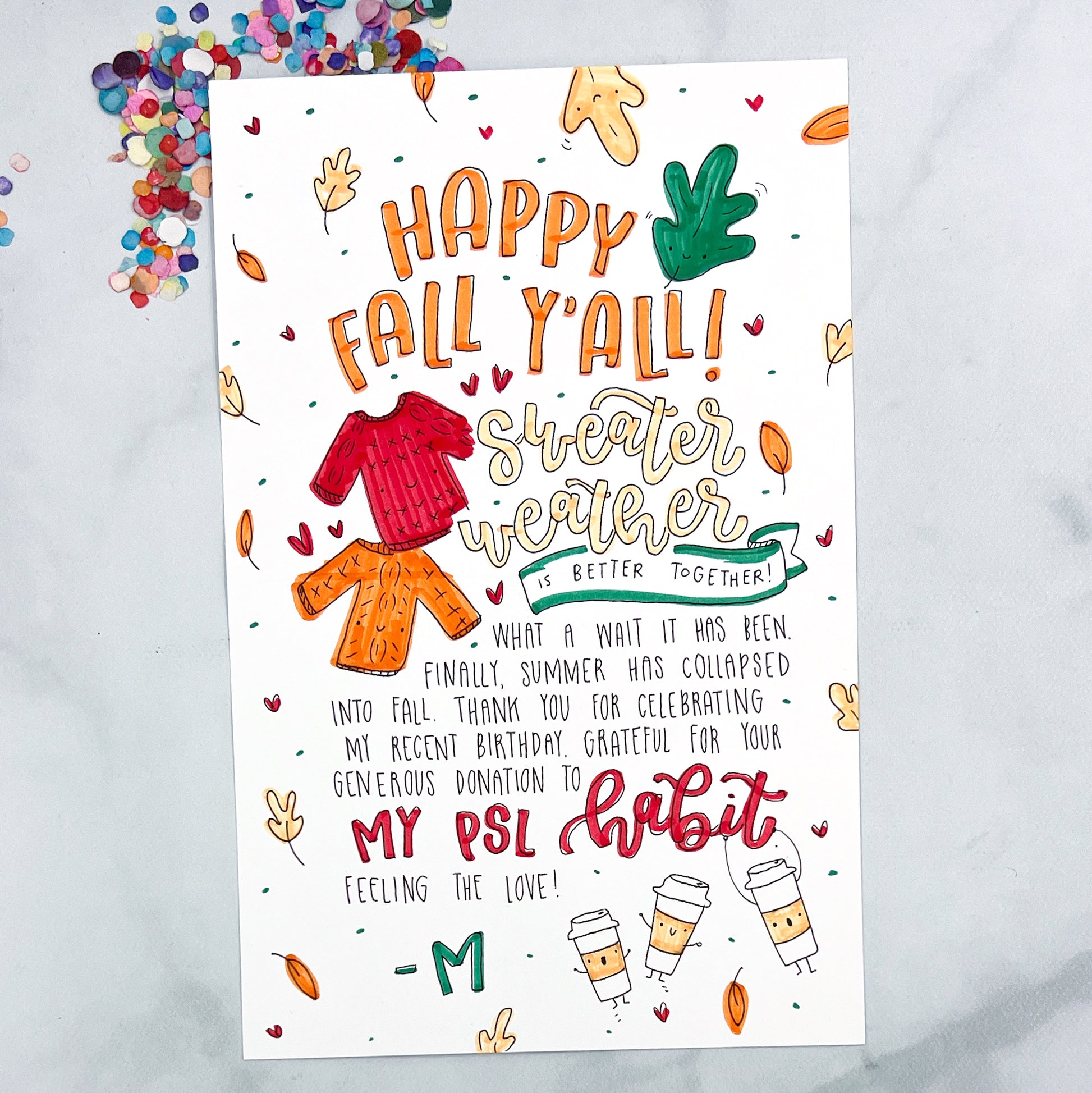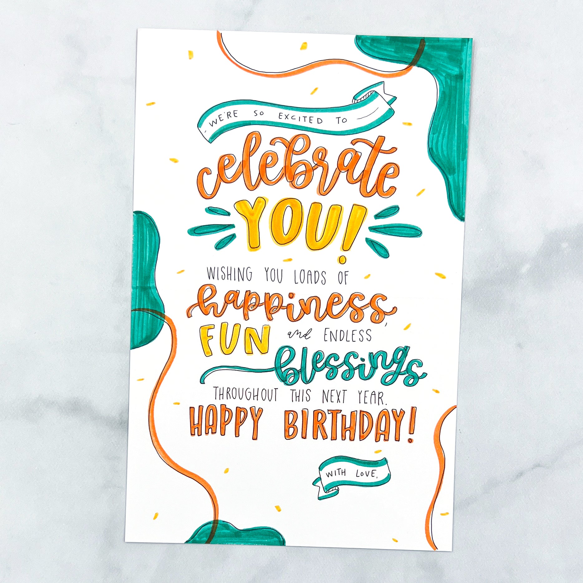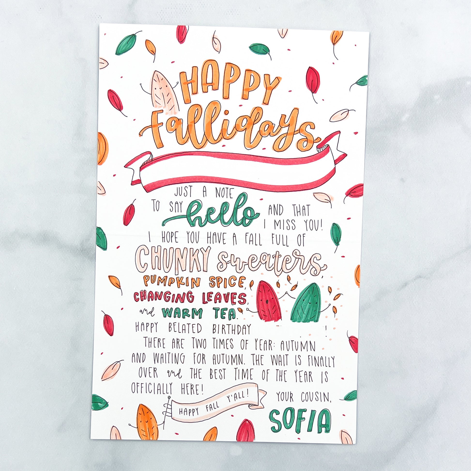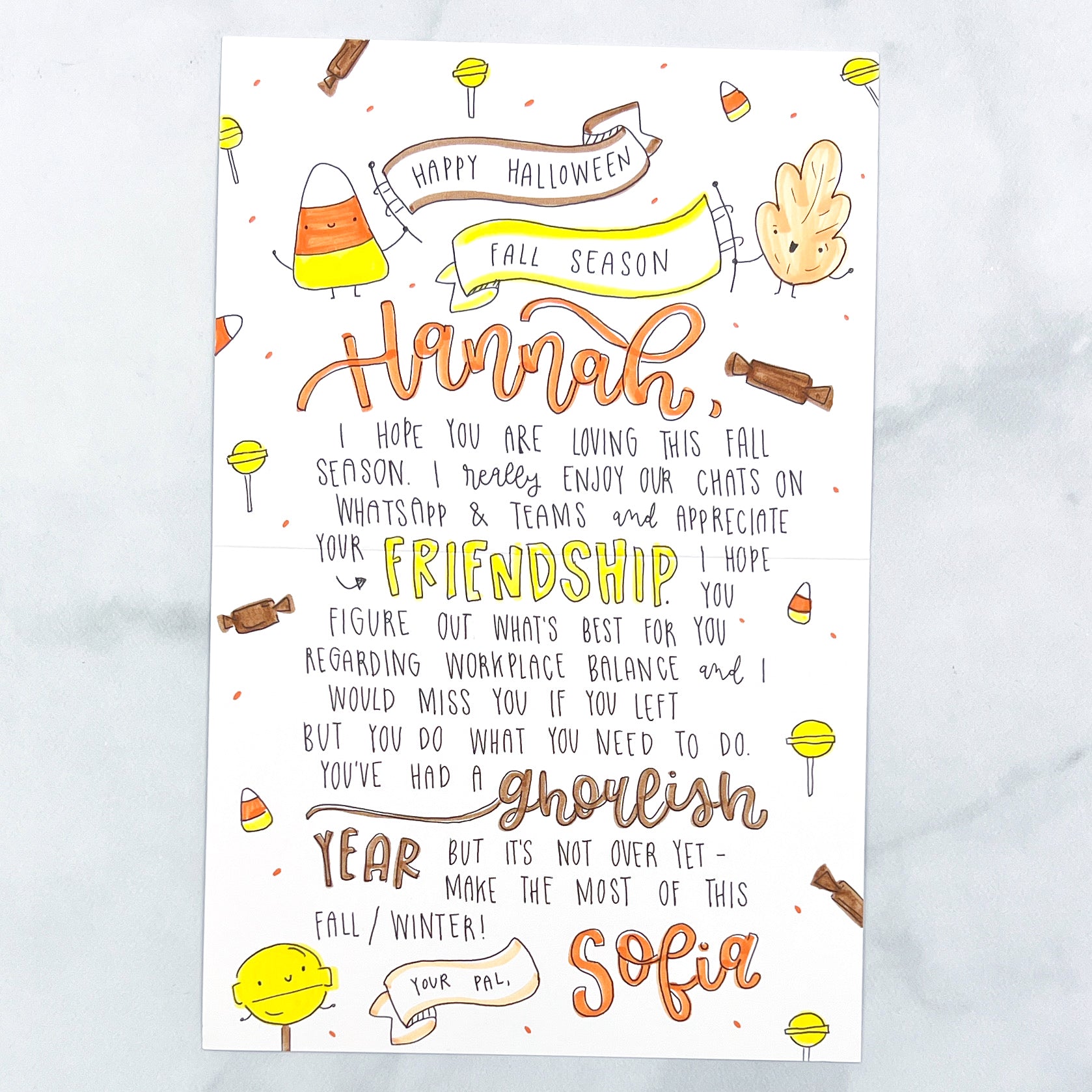 This design is printed on the front of the card, and then your message will be handwritten on the inside. The first image shows the front of the card design, and the other images show examples of handwritten messages inside the card.